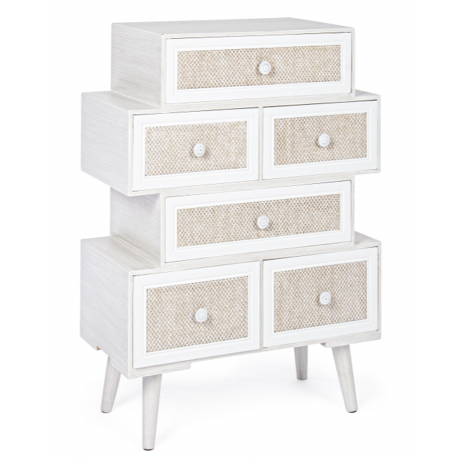Komoda MONTIEL jest rustykalnym meblem o ciekawym kształcie. Jej rama oraz nogi wykonane są z drewna sosnowego. Tylne i boczne ścianki oraz szuflady tworzy płyta MDF. Całość wykończono farbą na bazie wody, nadającą meblowi stylowego efektu postarzenia, który podkreśla jego charakter. Komoda posiada 6 szuflad. Ich fronty ozdobiono tkaniną z lnu i bawełny i zaopatrzono w metalowe, wykończone na biało gałki.