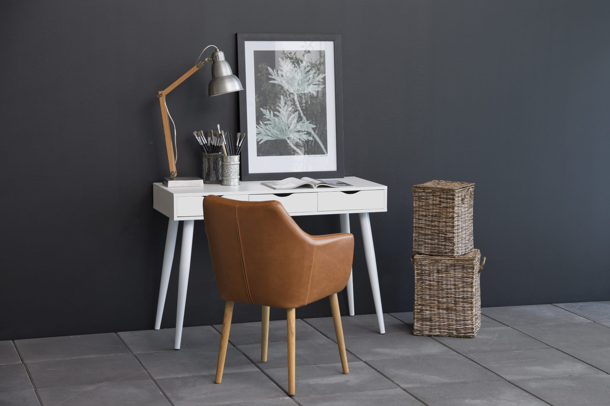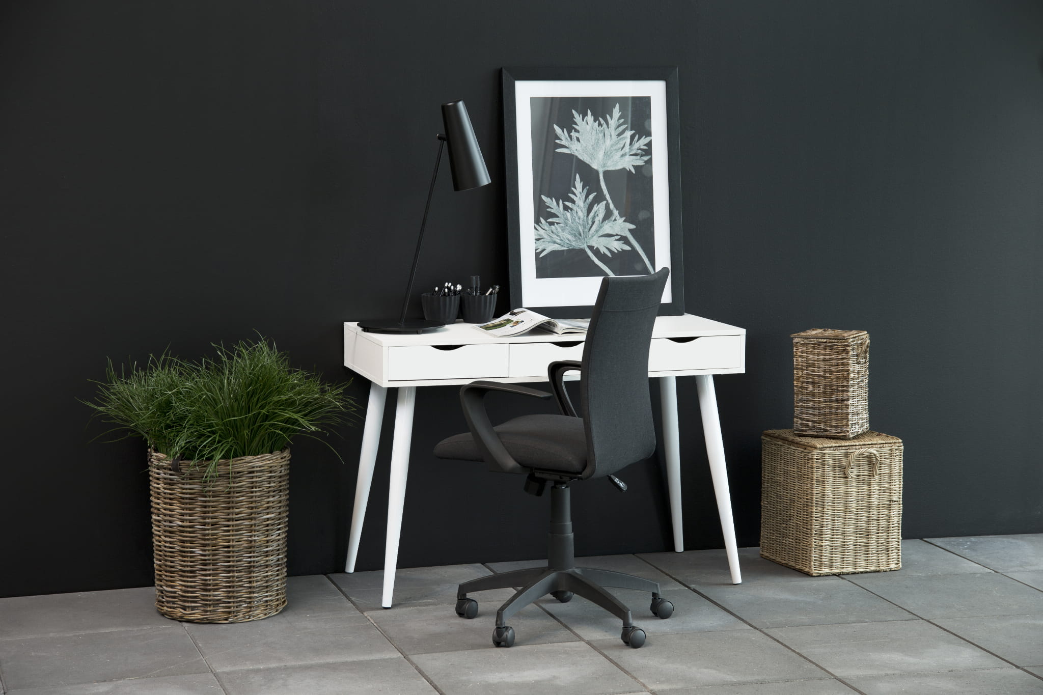 Biurko Neptun łączy minimalistyczny design z funkcjonalnością, idealnie sprawdzając się w nowoczesnych wnętrzach domowych i biurowych. Blat oraz trzy szuflady wykonane są z białej surowej melaminy, a stabilną konstrukcję zapewnia metalowa podstawa w białej powłoce proszkowej z kanałami. Zwężające się nogi nadają meblowi lekkości i podkreślają jego nowoczesny charakter.