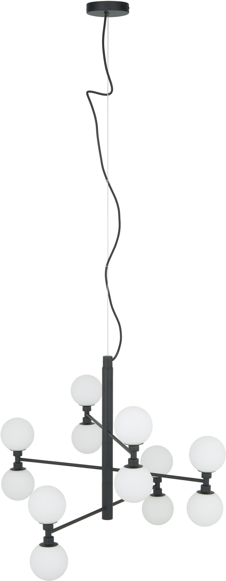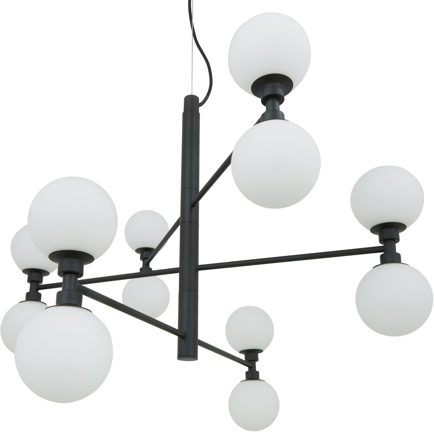 Nowoczesna interpretacja żyrandola, który oświetli całe pomieszczenie. „Grover” z kulistymi kloszami wykonanymi z półprzezroczystego szkła opalowego jest dla wszystkich, którzy lubią styl glamour. Model dostępny w matowej czerni. Duża lampa wisząca w kolorze matowej czerni - Klosze z półtransparentnego szkła opalowego - Stelaż lampy można indywidualnie regulować w poziomie - Nowoczesny żyrandol - Żarówki: 12 x LED, G9, max. 4 W - Oferta nie obejmuje żarówki - Możliwość przyciemniania za pomocą odpowiedniego mechanizmu przyciemniającego i żarówki Żarówki LED zużywają średnio ok. 80% mniej energii i mają do 25 razy dłuższą żywotność niż tradycyjne żarówki, a także wydzielają znacznie niższą ilość ciepła W trosce o nasze środowisko i w celu zagwarantowania najlepszej możliwej efektywności energetycznej zalecamy stosowanie żarówek LED.