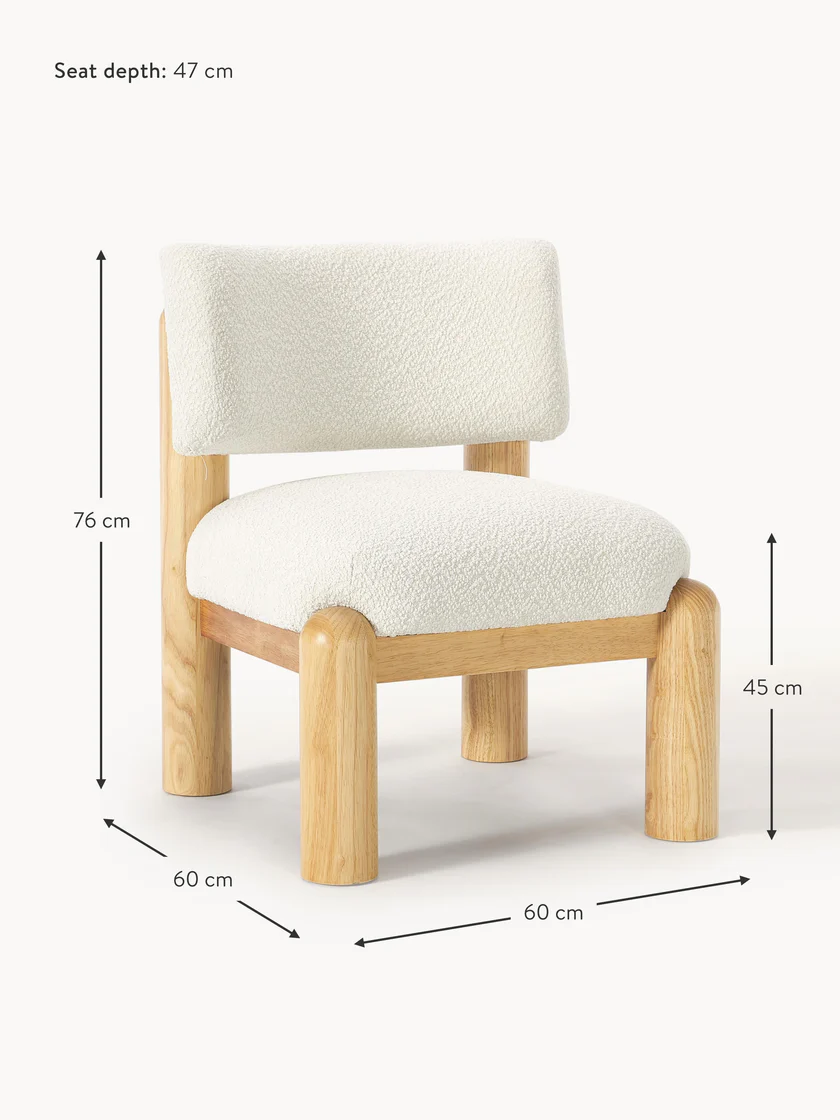 Połączenie naturalnego, jasnego drewna kauczukowego oraz miękkiego siedziska wykonanego z tkaniny Bouclé (100% poliester) nadaje meblowi nowoczesny, a jednocześnie przytulny charakter. Drewno użyte w produkcji pochodzi ze zrównoważonych źródeł i posiada certyfikat FSC®, dzięki czemu wybierasz produkt przyjazny środowisku.