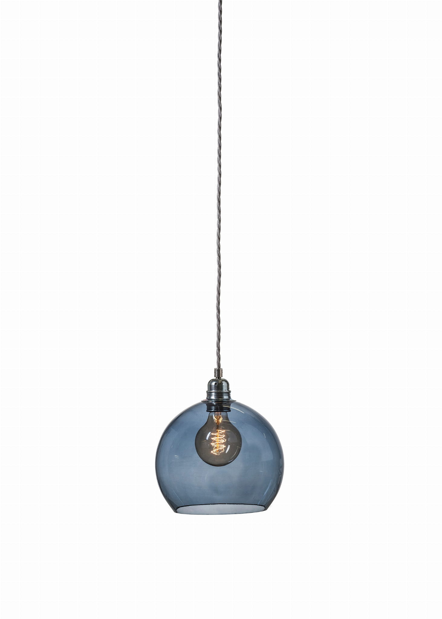 Seria lamp wiszących Rowan w wybarwieniu szkła Deep Blue - delikatnym, transparentnym kolorze niebieskiej szarości z wykończeniem w kolorze srebrnym. Lampa wisząca Rowan Deep Blue od duńskiej firmy EBB jest wytwarzana ręcznie w hucie, tradycyjną techniką dmuchania szkła. Posiada mosiężną oprawę oraz jakościowy pleciony przewód w srebrnym kolorze.