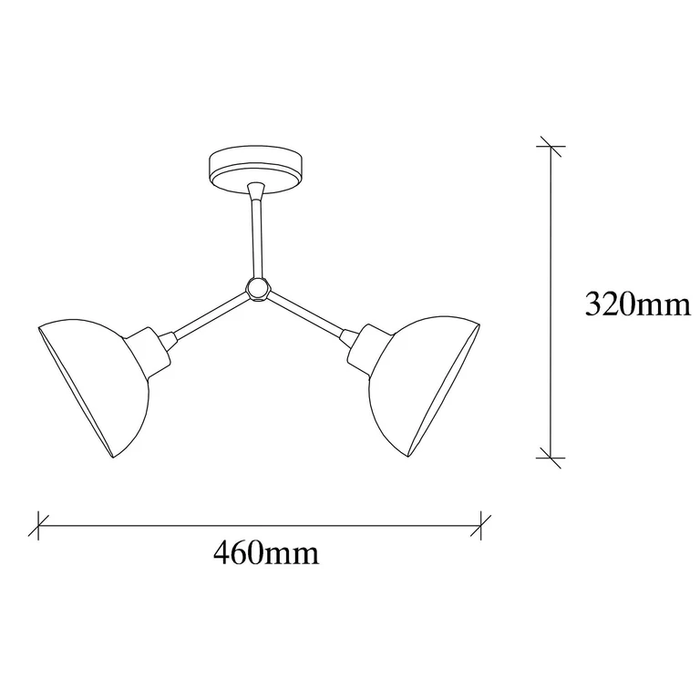 | Metalowa rama Rozmiar: 46 x 15 cm Wysokość: 32 cm Średnica klosza: 15 cm Wysokość klosza: 7 cm Średnica cokołu: 10 cm Wysokość cokołu: 3 cm Mocowanie: 2 x E 27 Max 40 W |