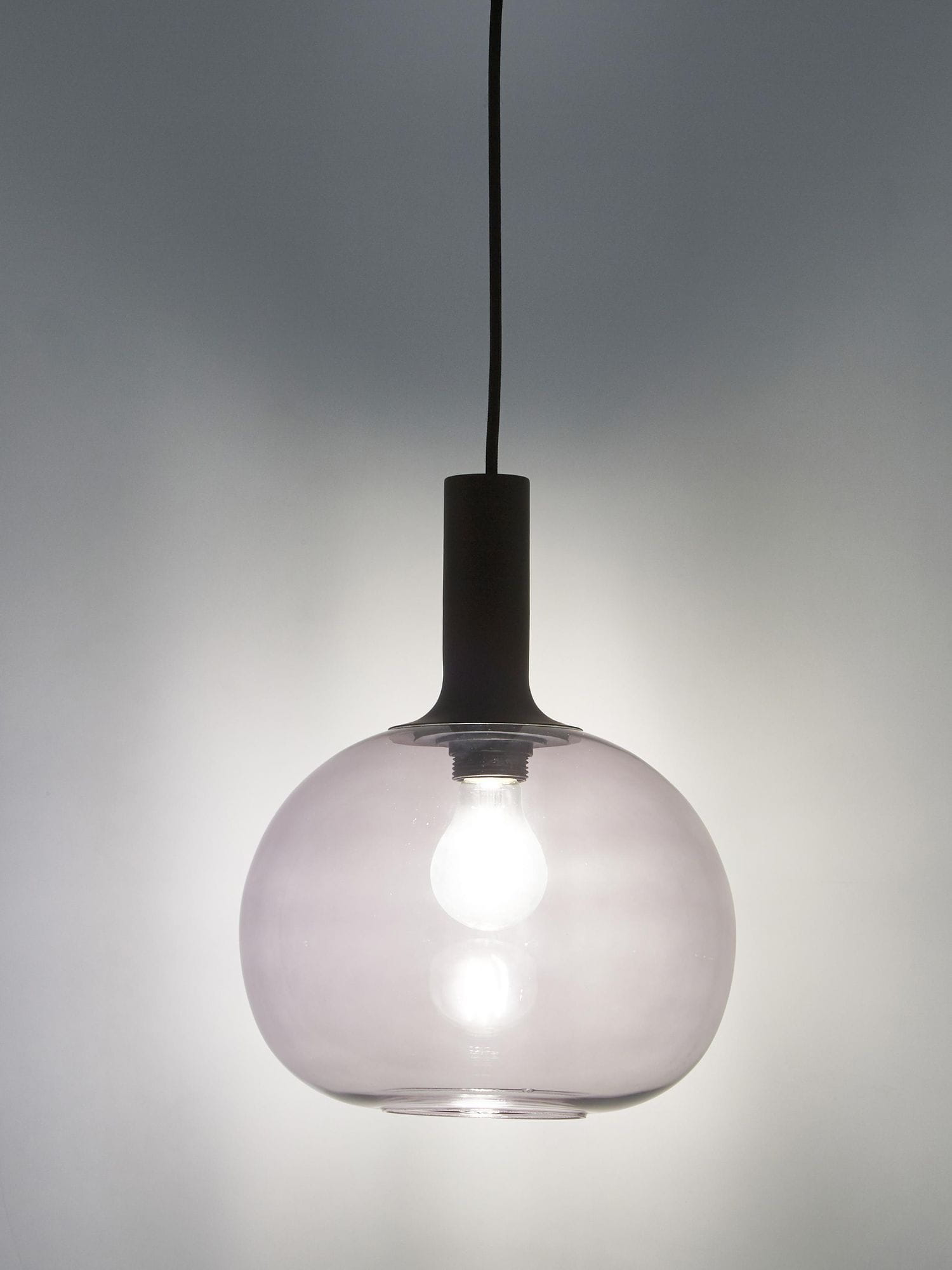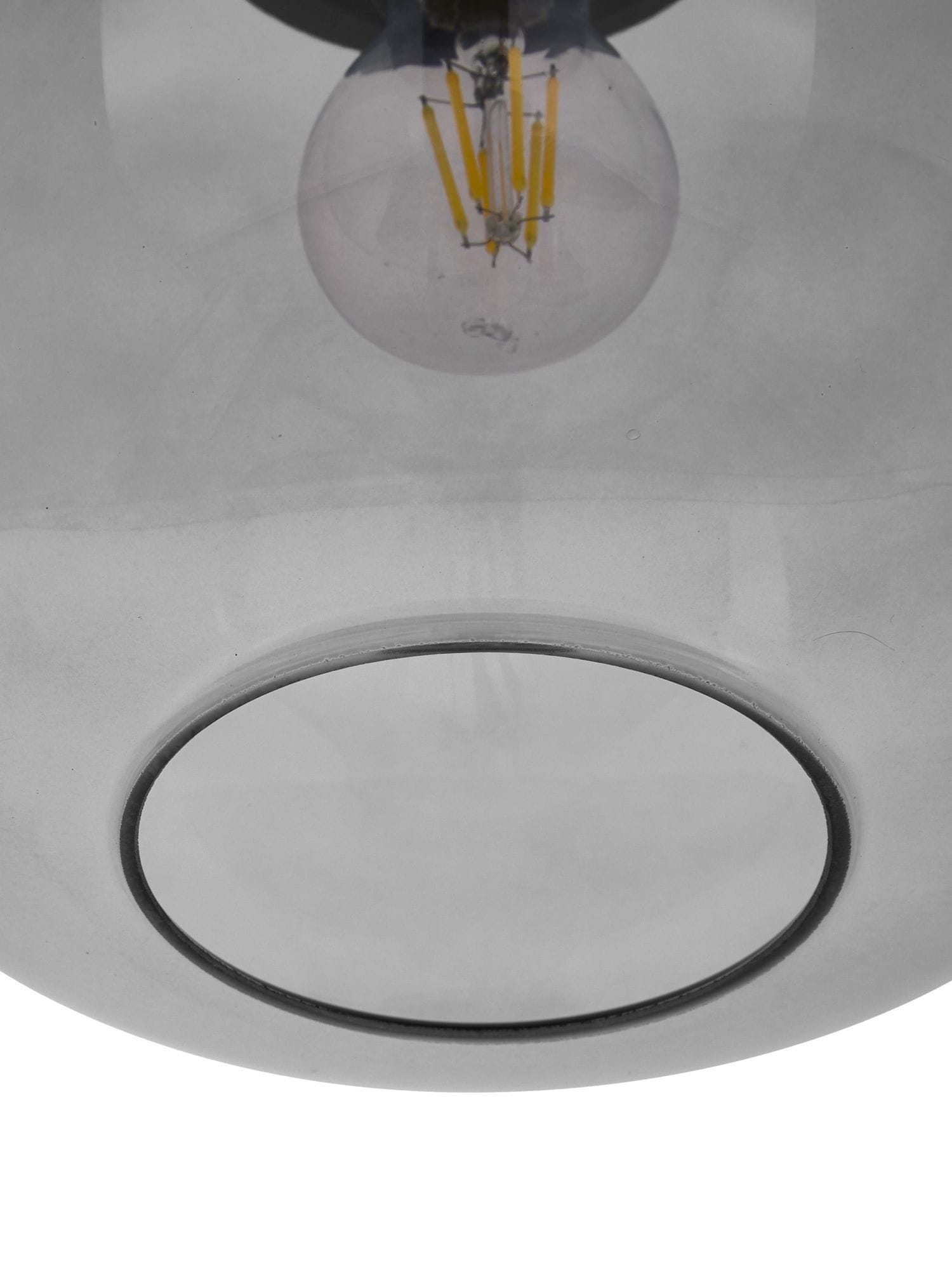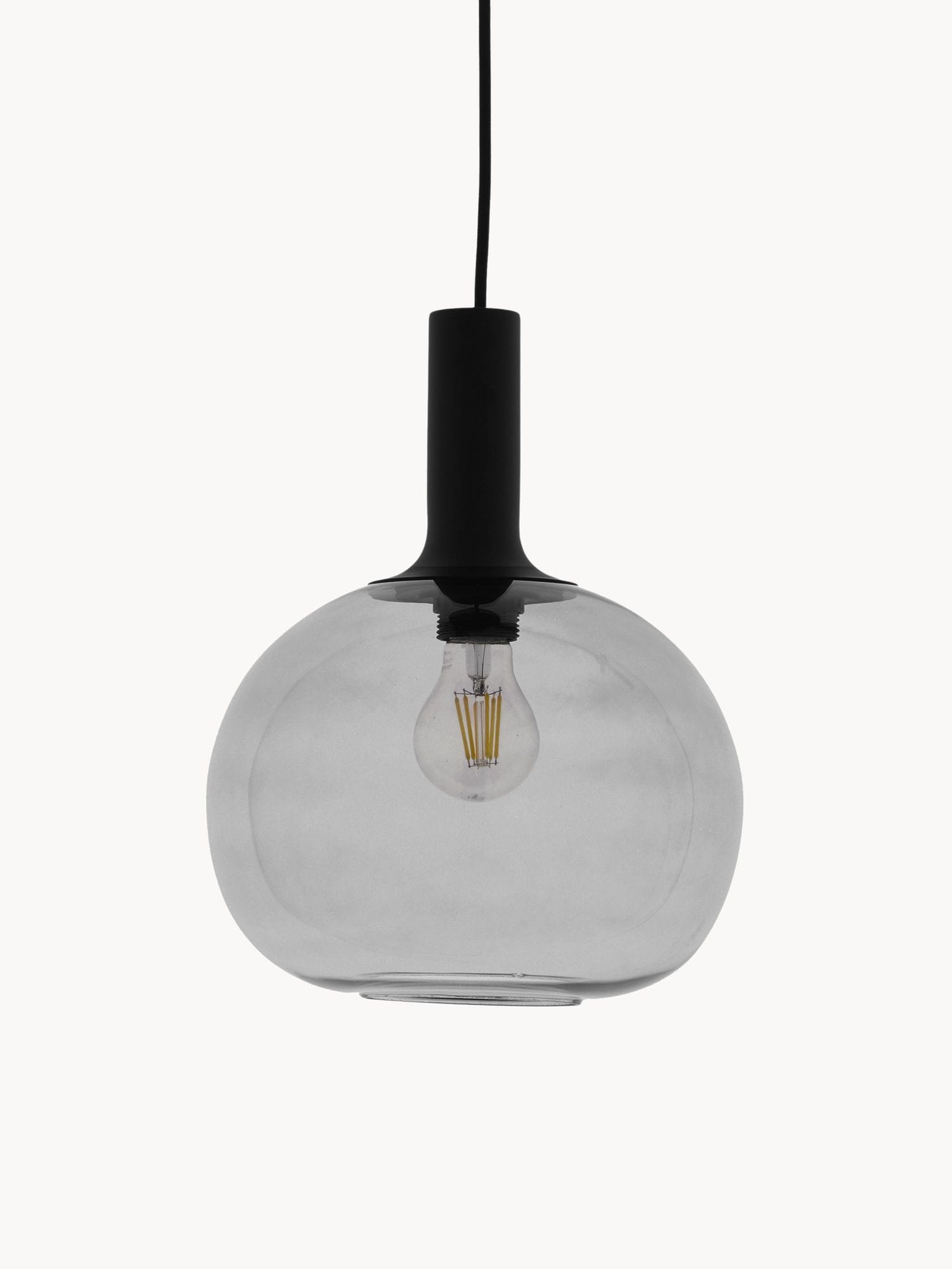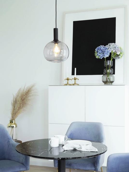 Nowoczesna lampa wisząca z kloszem wykonanym ze szkła dymnego.