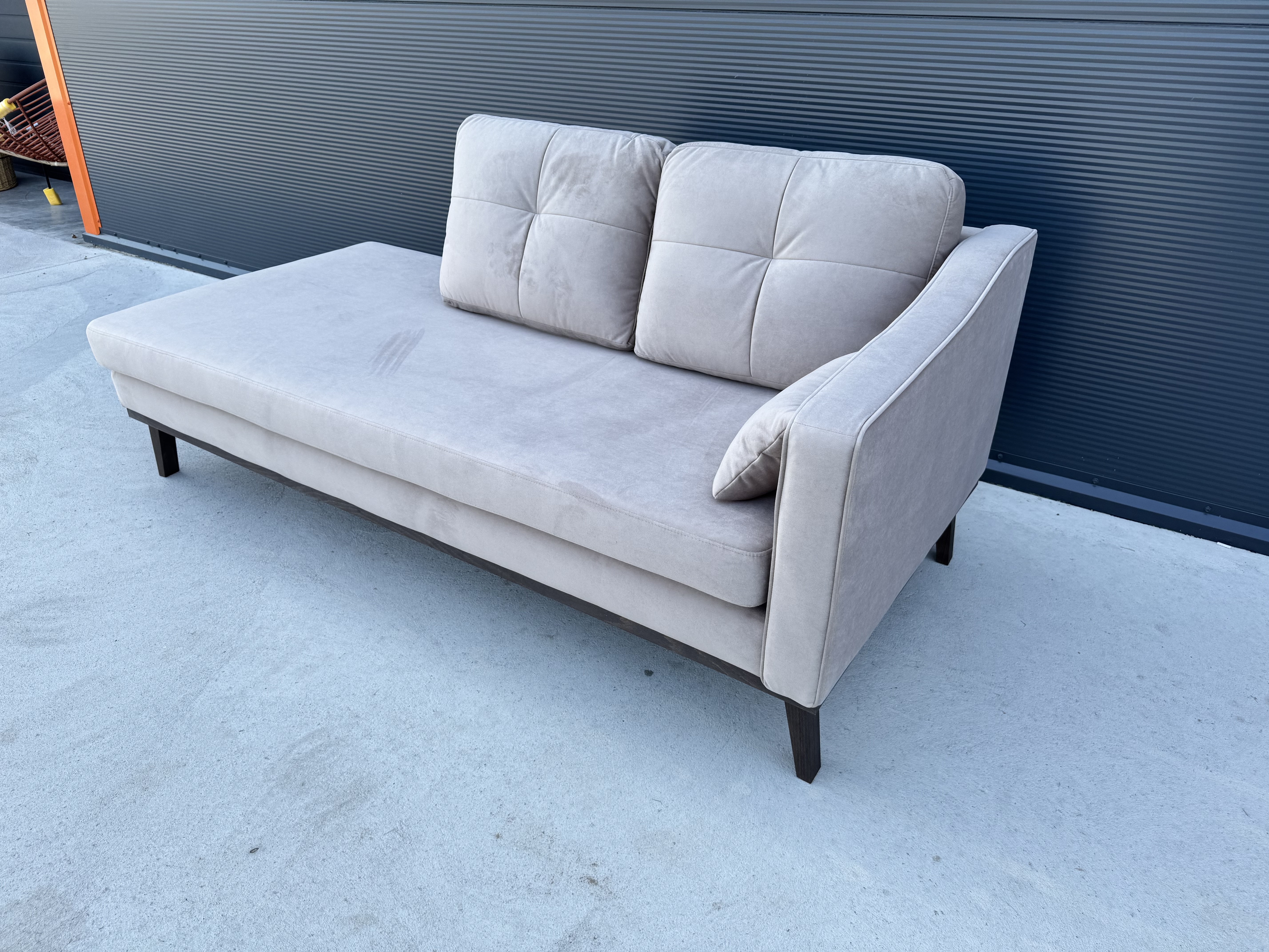 Smukła konstrukcja, cienka podstawa oraz subtelny podłokietnik nadają meblowi lekkości i wyjątkowego charakteru. Miękkie poduszki z dekoracyjnymi przeszyciami zapewniają komfort, a całość osadzona na drewnianych nogach podkreśla nowoczesną estetykę wnętrza.