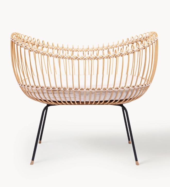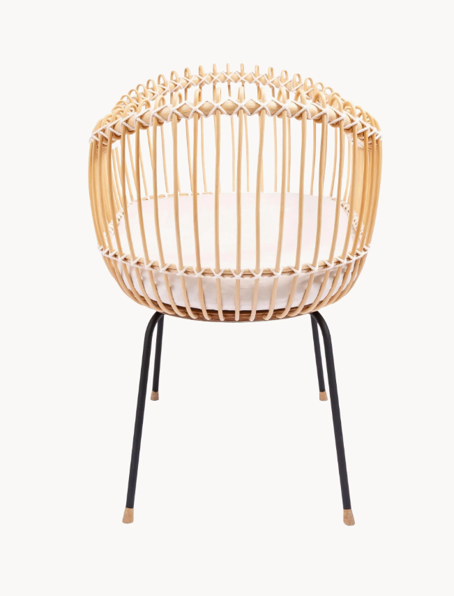 Delikatny splot zapewnia koszowi dużą przejrzystość, dzięki czemu maluchy mają doskonały widok na otoczenie. Ciasno splecione gałązki nadają konstrukcji dodatkową stabilność. Smukła drewniana podstawa łączy korpus z lekką, a jednocześnie wyjątkowo stabilną ramą, mocowaną za pomocą dyskretnych śrub.
