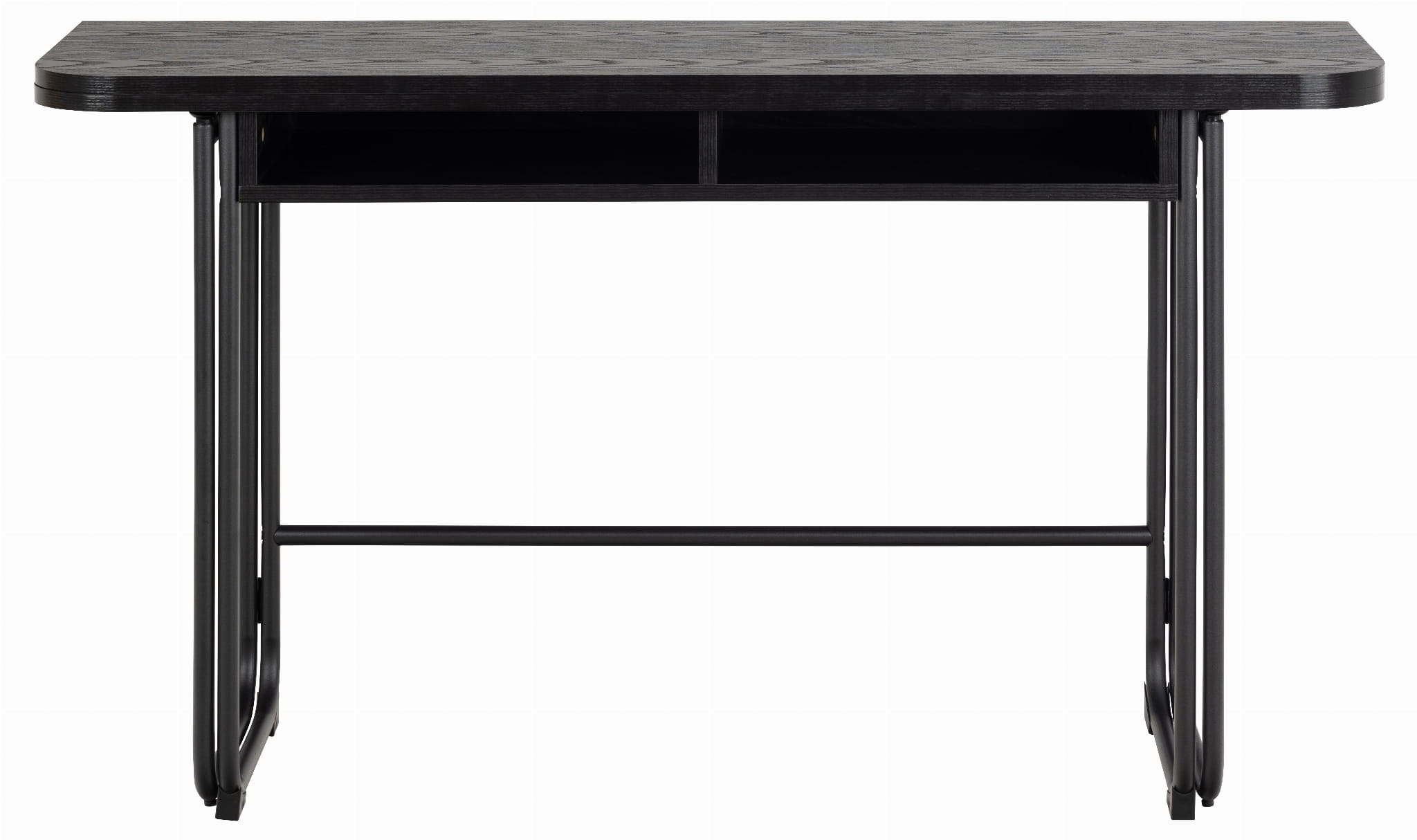 Przedstawiamy stół jadalny, który pozwala sprytnie wykorzystać przestrzeń. Zaprojektowany z wbudowanym skrzydłem przedłużającym, powierzchnię można zwiększyć na szerokość o 40 cm. Stoi na czarnej rurowej podstawie sanek i podtrzymuje elegancki blat z teksturowaną powierzchnią w czarnym jesionowym dekorze. Umieść go w pomieszczeniu lub przy ścianie – będzie wyglądał równie dobrze.