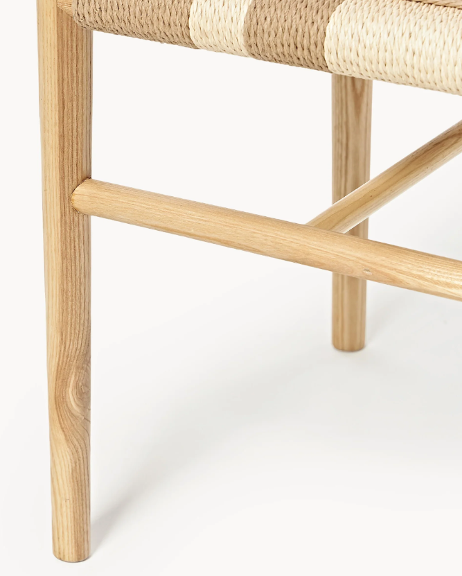 Seria mebli MANI łączy minimalistyczny design z subtelnymi, artystycznymi detalami, które nadają każdemu elementowi wyjątkowego charakteru. Starannie wyplatane siedzisko tworzy abstrakcyjny wzór, dzięki czemu mebel przyciąga wzrok i wprowadza do wnętrza lekkość oraz naturalną elegancję. Delikatna konstrukcja z jasnego drewna w połączeniu z dekoracyjnym splotem sprawia, że stołek doskonale odnajdzie się w jadalni, kuchni lub strefie wypoczynkowej.