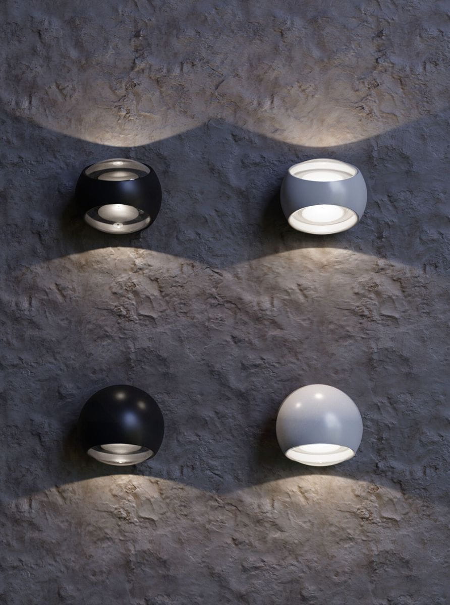 Kinkiet elewacyjny 1 punktowy z wbudowanym źródłem światła LED świecącym góra-dół. Elementy metalowe wykonane z aluminium i pomalowane na kolor biały. Obudowa odporna na wahania temperatur i korozję.