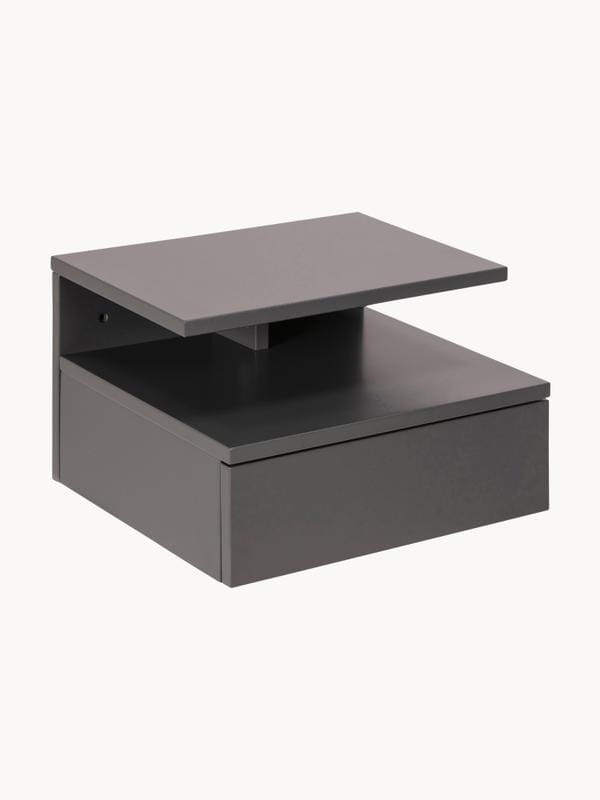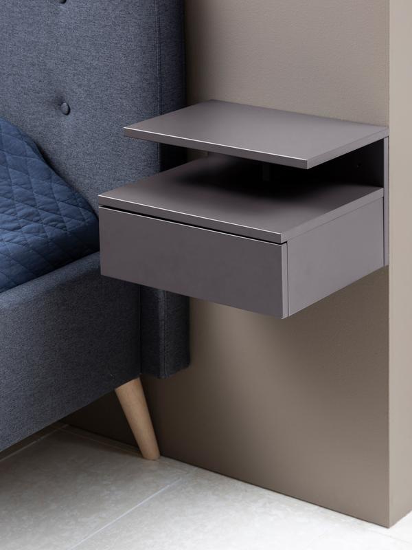 Stolik nocny posiada małą szufladę oraz otwartą przegródkę.
