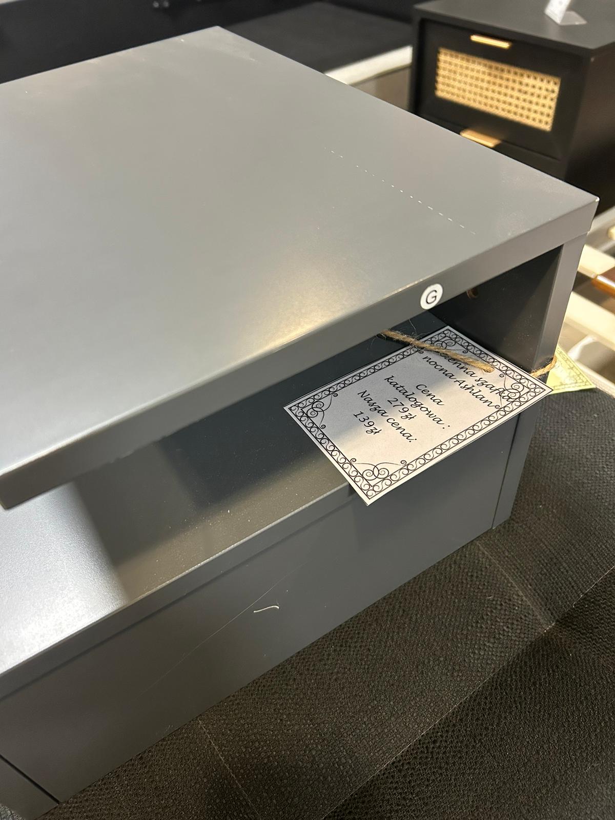 Stolik nocny posiada małą szufladę oraz otwartą przegródkę.