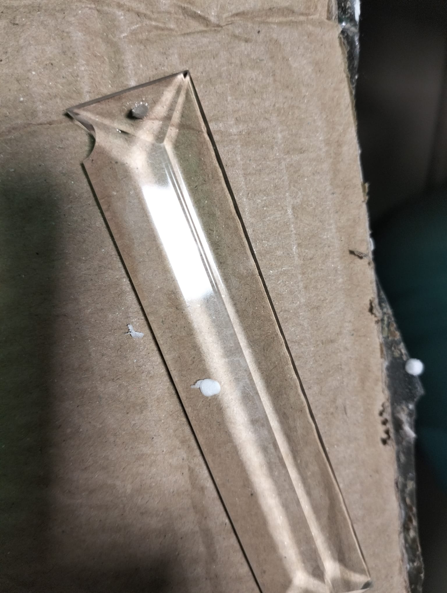 Jeden kryształek posiada niewielki defekt, który nie przeszkadza w użykowaniu oraz jest niewidoczny po zawieszeniu.
